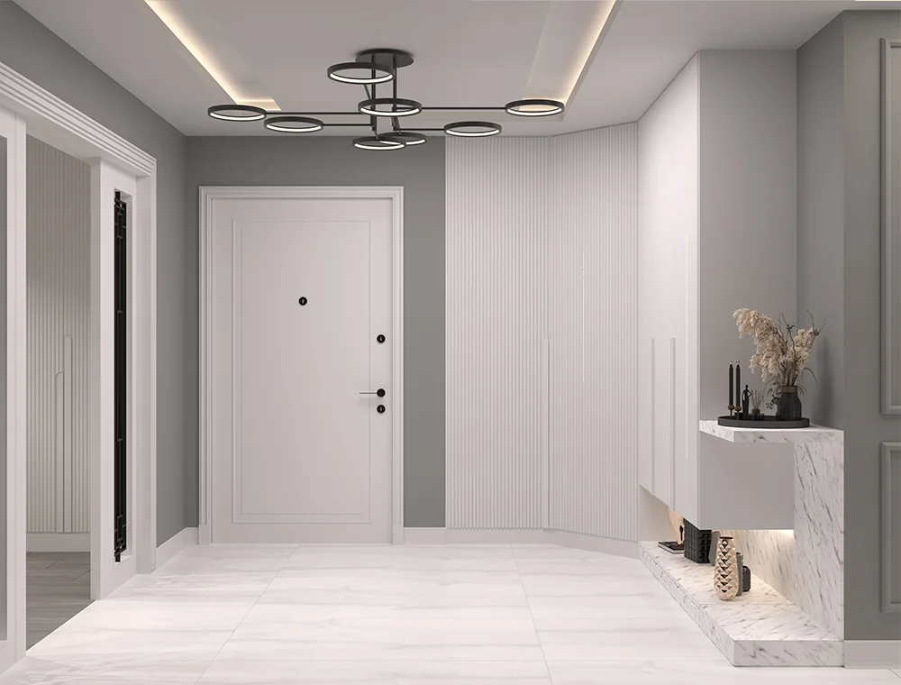 E.F. Konutu’nun antre tasarımında, şıklık ve işlevselliği bir araya getirerek sıcak bir karşılama alanı oluşturduk. İlk izlenimin önemli olduğu bu alanda, zarif detaylar ve modern dokunuşlarla davetkâr bir atmosfer yarattık. Aydınlatmayı stratejik olarak konumlandırarak alanı ferah ve aydınlık hale getirdik.