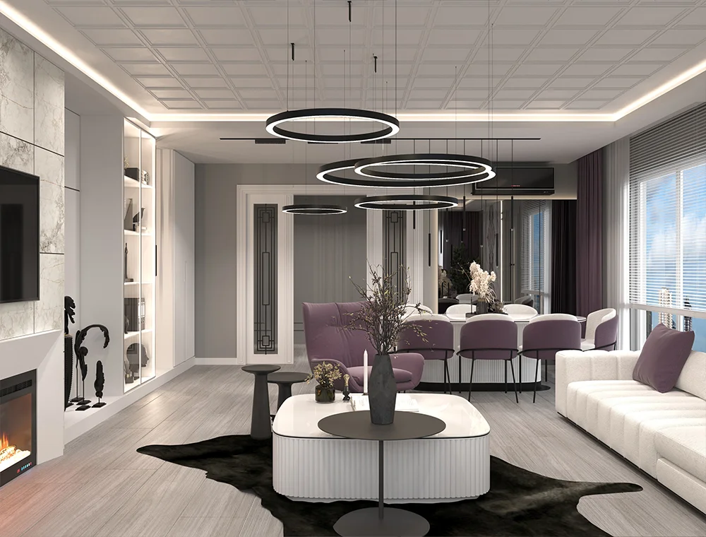 Malzeme seçiminde kaliteli ve dayanıklı yüzeyler tercih edilirken, doğal ahşap dokular, yumuşak kumaş detayları ve dikkat çekici aydınlatmalarla sıcak bir ortam yaratıldı. Alanın bütünlüğünü sağlayan modern mobilyalar ve sanatsal dokunuşlarla, E.F.’nin salonunu zarif ve keyifli bir yaşam alanına dönüştürdük.