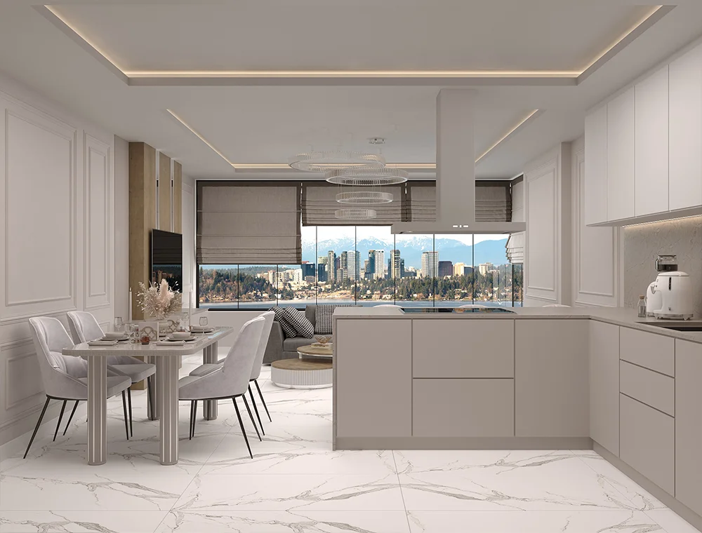 Akıllı depolama sistemleri ile mutfakta düzeni sağlarken, dayanıklı ve şık malzeme seçimleriyle uzun ömürlü bir kullanım sunuyoruz. Doğal ışık ve doğru aydınlatma teknikleri ile ferah bir atmosfer oluşturduk. Renk ve malzeme seçimlerinde hem estetik hem de hijyenik çözümleri ön planda tutarak, mutfağınızda konforlu bir deneyim sunuyoruz.