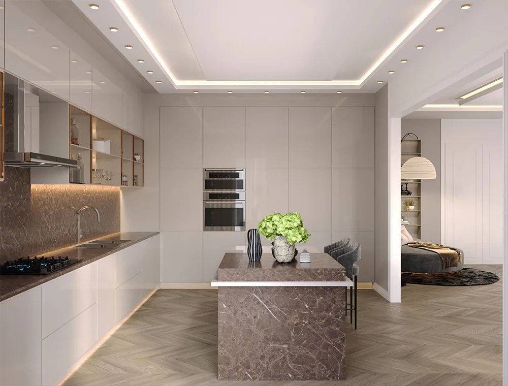 Modern çizgilerle şekillendirilen mutfakta, geniş tezgah alanları, işlevsel dolap sistemleri ve kaliteli malzeme kullanımıyla uzun ömürlü ve dayanıklı bir yapı oluşturduk. Doğru aydınlatma ve renk seçimleriyle ferah bir atmosfer sağlarken, teknolojiye uyumlu mutfak ekipmanları için uygun alanlar tasarladık.