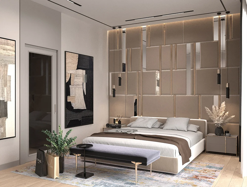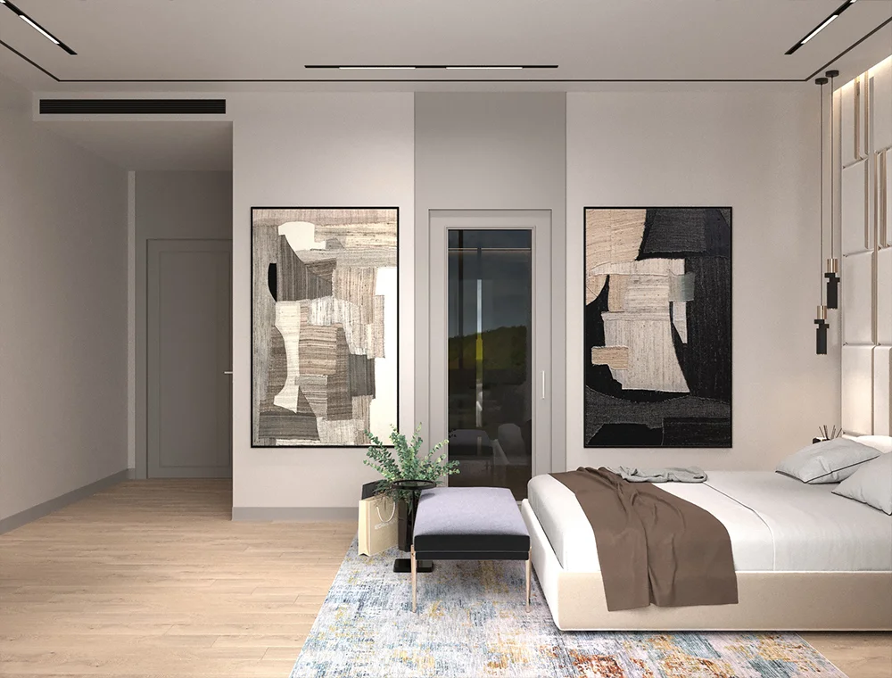 Yatak odası, ferah bir ortam sunmak için geniş pencerelerden gelen doğal ışığın etkisini en iyi şekilde kullanacak şekilde tasarlandı. Ayrıca, odanın akustiğini düzenleyerek uyku kalitesini artıran bir ortam sağladık. Modern dokunuşlarla, konforu ve şıklığı bir araya getiren bu tasarım, kişisel alanınıza estetik ve huzur katıyor.