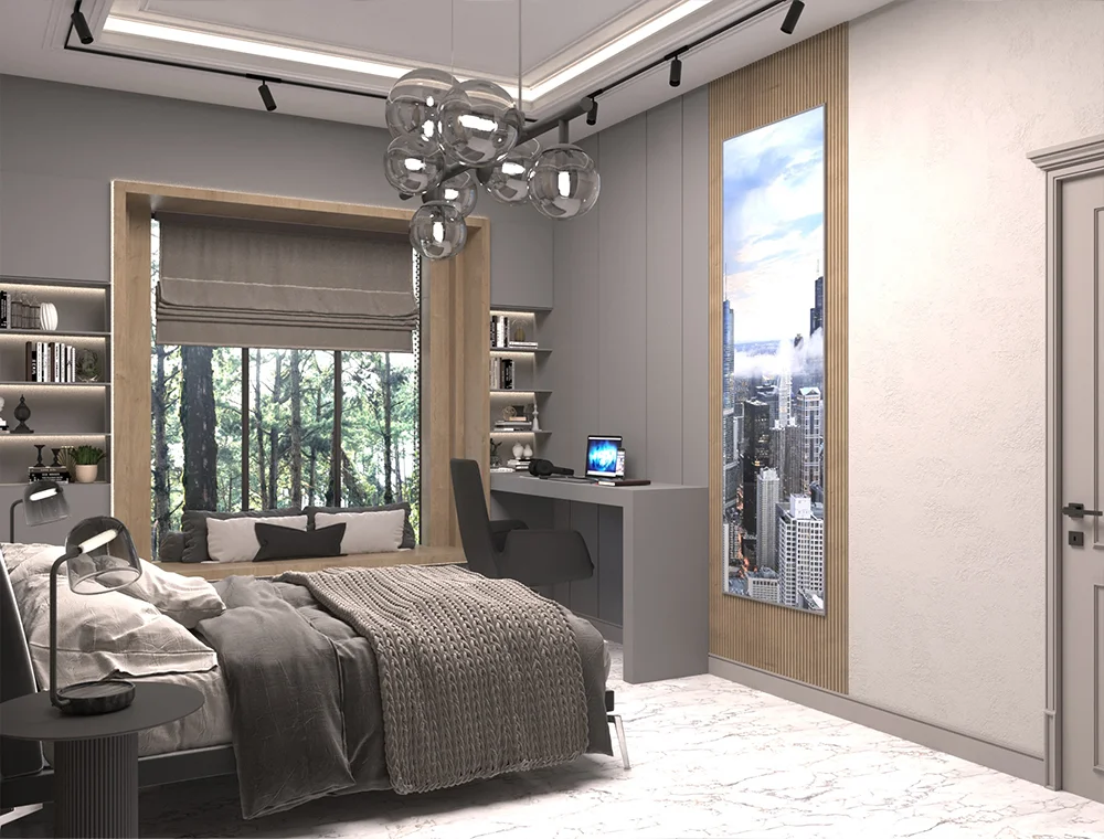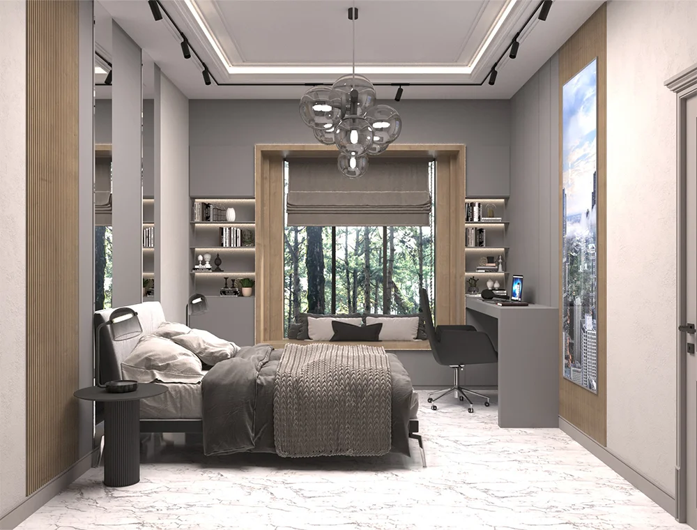 Çocukların yaşına uygun, rahat ve ergonomik mobilyalar öneriyoruz. Çalışma masaları, rahat yataklar ve çok fonksiyonlu depolama üniteleri odada yer alır.