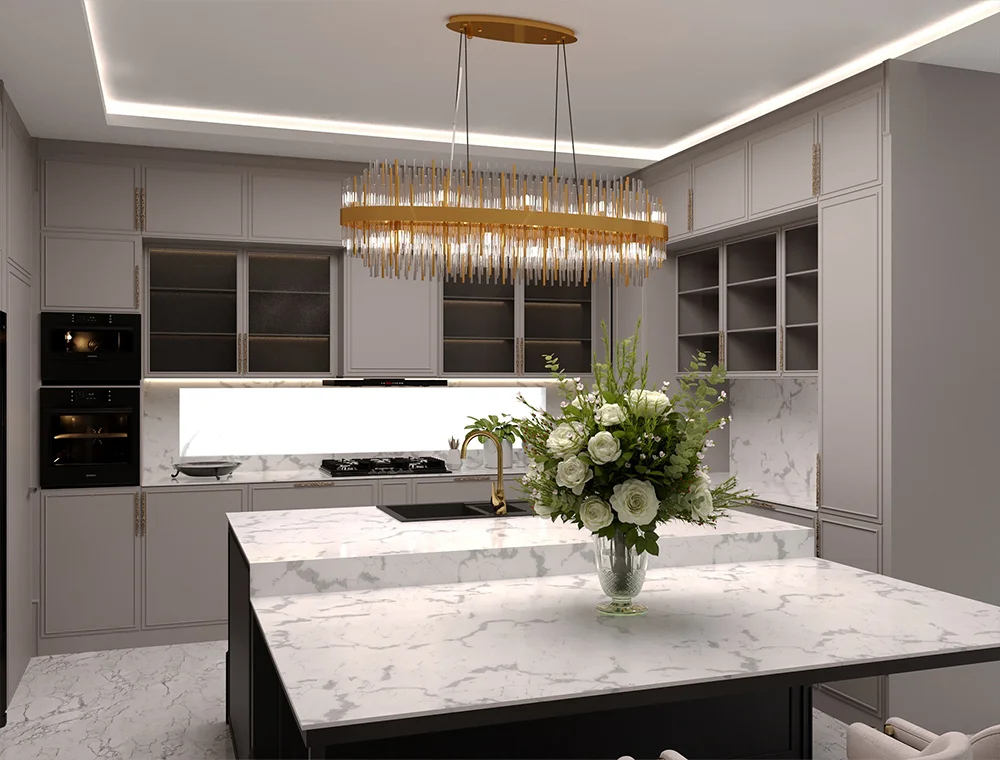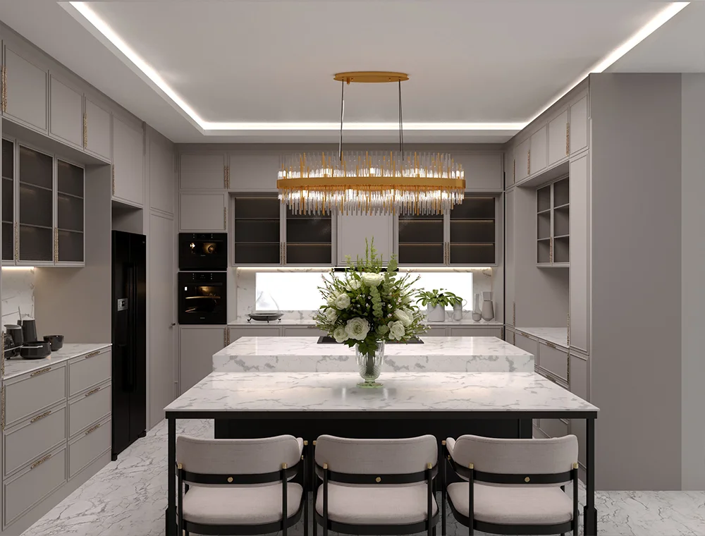 Pratik depolama alanları, geniş tezgahlar, şık ve teknolojik mutfak aletleri, her detayda kullanım kolaylığı ve şıklık birleştirildi. Yüksek kaliteli malzemeler, modern renk paletleri ve zarif tasarımlar sayesinde mutfağınız, hem göz alıcı hem de rahatlatıcı bir ortam haline geliyor. Mutfak adası, açık raf sistemleri ve akıllı depolama çözümleri ile kullanımınızı kolaylaştıracak şekilde düzenlendi.