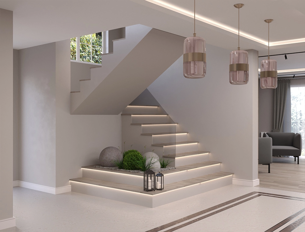 Alanı daha geniş göstermek için doğru aydınlatmalar seçiyor, sıcak ve davetkâr bir atmosfer oluşturuyoruz.