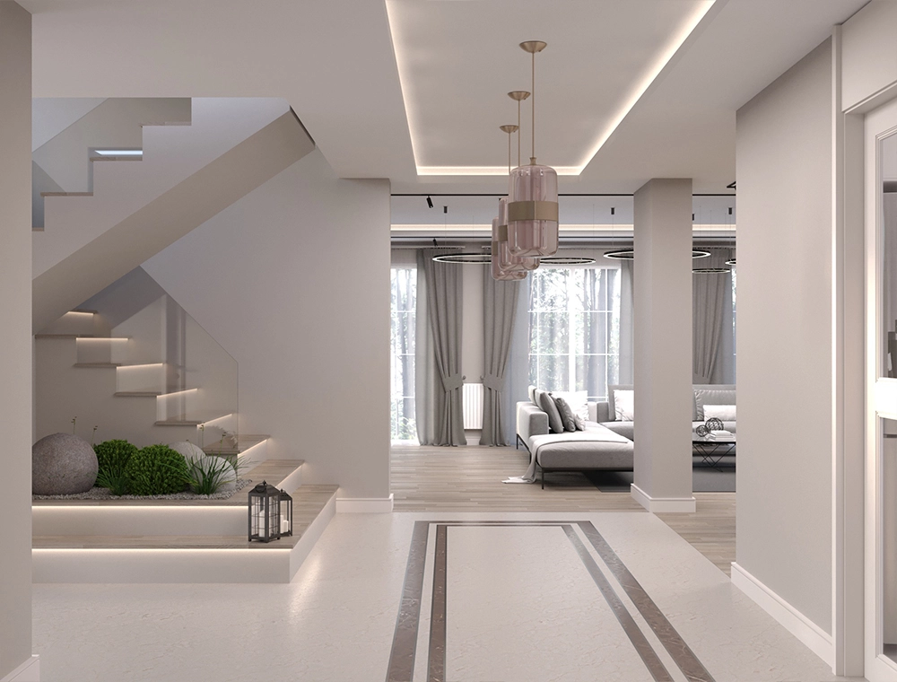 Aydınlatmadan mobilya düzenine kadar her ayrıntıyı titizlikle planladık. Şık ve fonksiyonel depolama çözümleri, dekoratif aynalar, oturma alanları ve doğru aydınlatmalar ile antreyi hem geniş hem de ferah gösteren bir atmosfer oluşturduk.